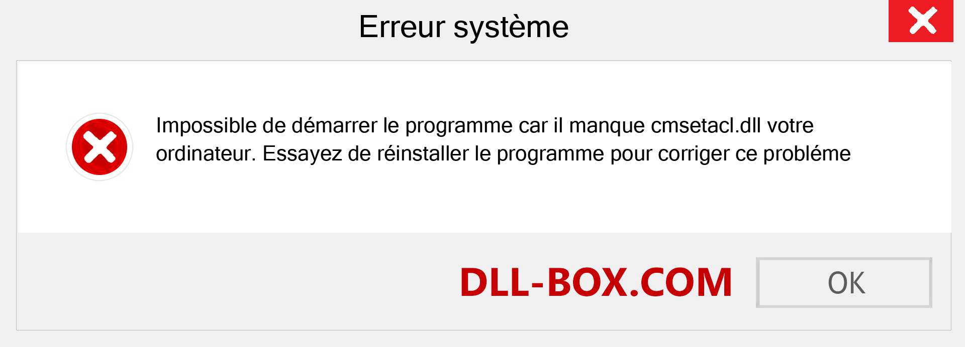 1. Le programme ne peut pas démarrer car cmsetacl.dll est absent de votre ordinateur. Essayez de réinstaller le programme pour résoudre ce problème.
